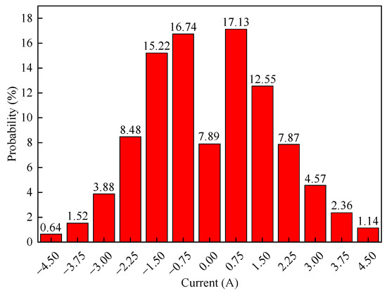 The charging and discharging strategy for the battery cycles in the RW10 dataset is a random walk strategy: the charging and discharging currents are randomly selected from the set {−4.5 A, −3.75 A, −3 A, −2.25 A, −1.5 A, −0.75 A, 0.75 A, 1.5 A, 2.25 A, 3 A, 3.75 A, 4.5 A}. Negative currents represent charging, while positive currents represent discharging. During battery operation, a selected current setting is applied until the terminal voltage exceeds the range of 3.2 V to 4.2 V, or until a specific charge–discharge condition persists for five minutes. After each charging or discharging period, there is a rest period of less than one second during which the current is 0 while a new charging or discharging current setpoint is selected. The current probabilities are shown in Figure 5. From the RW10 dataset, a subset of 9000 data groups was selected for analysis, with each group containing temperature, voltage, and current data. The first 80% of the data are used for training, and the remaining 20% are used for testing. The relationship between battery temperature and voltage and current is shown in Figure 6.
