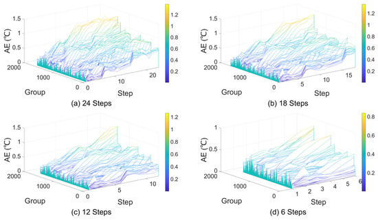 Figure 9 illustrates that the absolute errors of the multi-step prediction results are generally within 1 °C. As the prediction horizon shortens, the prediction errors tend to decrease. The frequency distribution of the maximum prediction errors is shown in Figure 10.