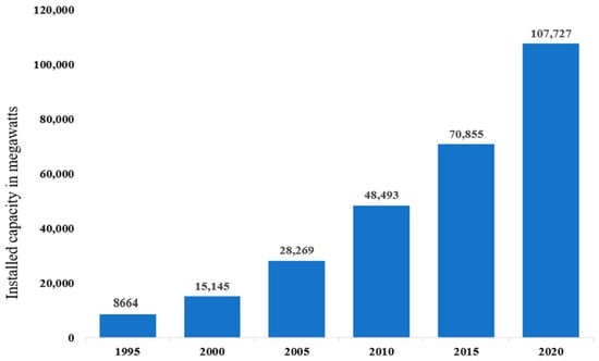 Installed capacity (MWt) of geothermal heat pump systems worldwide from 1995 to 2020 [18].