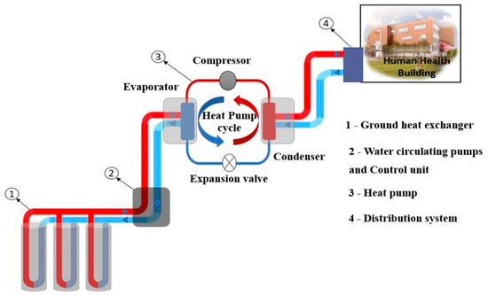 The geothermal heat pump system consists of a vertical or horizontal closed-loop ground heat exchanger (GHE), a water circulating pump and control unit, a heat pump, and a distribution unit system, as shown in Figure 2. The vertical GHE is a suitable alternative when space is limited and the ground surface consists of rocky terrain. Additionally, vertical GHEs provide greater performance stability compared to horizontal systems because they are installed at deeper depths, where ground temperatures remain consistent and are unaffected by seasonal weather variations or surface climate conditions. This deeper placement ensures more reliable and efficient heat exchange throughout the year. Although the installation of vertical GHEs is significantly more expensive than horizontal systems, they are more commonly installed due to their performance advantages [19,20,21]. The GHE is a critical component of the GHPS due to its direct contact with the Earth, which effectively harnesses its thermal energy. The GHE’s performance significantly impacts the overall system efficiency. The maximum benefits from the Earth’s thermal energy can be reached when the GHE is optimally designed with careful consideration of configuration, installation location, borehole heat exchanger capacity, and performance factors [22]. Therefore, improvements should emphasize optimizing the characteristics of the GHE, as enhancements in these aspects are likely to improve the overall efficiency of the GHPS [5,7,23].