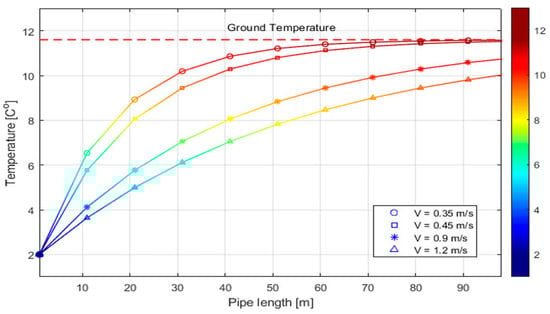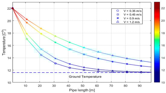 According to Figure 9, the water temperature increased exponentially as water flowed inside the pipe, starting at 2 °C and reaching the ground temperature of 11.6 °C at pipe lengths of 90 m and 95 m when the water velocity was 0.35 m/s and 0.45 m/s, respectively. However, when the water velocity increased to 0.9 and 1.2 m/s, the water temperature did not reach the ground temperature by the pipe’s exit, resulting in significant heat energy loss and reduced efficiency. The water temperature decreased exponentially along the pipe, starting at 22 °C and approaching the ground temperature of 11.6 °C at pipe lengths of 90.5 m and 95.5 m when the water velocity was 0.35 m/s and 0.45 m/s, respectively. However, as shown in Figure 10, when the water velocity increased to 0.9 and 1.2 m/s, the water temperature did not reach the ground temperature.
