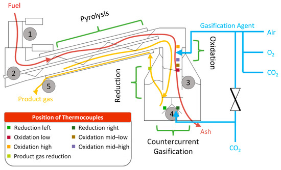 Figure 2. The feedstock is transported from a bunker into the reactor via a screw conveyor, in which it is pyrolyzed by heating it with the produced gas (double-pipe design). The pyrolyzed feedstock is then transported through the oxidation zone of the gasification reactor where most of the gasification agent is added to convert the emerging pyrolysis gas into the product gas. This zone is followed by a reduction zone that consists of the pyrolyzed feedstock formed in the process. In this zone, the charcoal is partially oxidized while the produced tars are cracked. Furthermore, CO