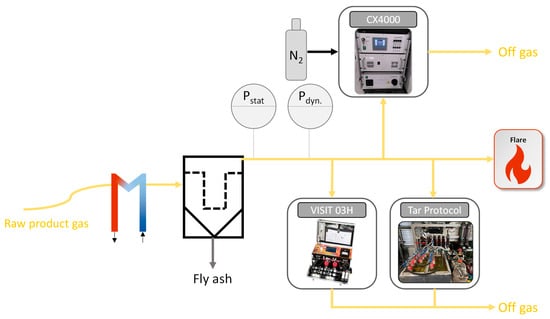 The produced synthesis gas was characterized by a variety of different analyzers and methods regarding its composition and tar content. All measurements were carried out in the cooled product gas (approx. 50 °C) after particulate removal to minimize any interference of particulates with the measurement equipment. Permanent gasses such as O2, H2, CO, and CH4 were measured using a multi-gas measurement device (VISIT 03H, Messtechnik Eheim GmbH, 74193 Schwaigern, Germany) equipped with nondispersive infrared sensors (NDIRs), thermal conductivity detectors (TCDs), and electrochemical sensors. In order to protect the sensors of the device, sample gas preparation was used. First, the sample gas was washed using a washing oil and water and then it was passed through silica gel, activated carbon, and a series of filters. The measurement of CO2 and selected components like hydrocarbons (C1–C6), acid gasses, and nitrogen oxides was taken using Fourier-transform infrared spectroscopy (FTIR, CX4000, Gasmet Technologies GmbH, 76131 Karlsruhe, Germany). As the total concentration of infrared (IR) active sample gas components was expected to be too high, the sample gas was diluted using pure nitrogen (grade: 5.0). This was carried out to prevent a phenomenon called total absorption, where the gas is so IR-active that it absorbs all the light from the IR source in the FTIR, making it impossible to characterize the gas. Additionally, gas components that occur in smaller concentrations cannot be detected in the resulting spectra of undiluted sample gasses due to broadening of the CO, CO2, and H2O peak at high concentrations due to overlapping. Therefore, a volumetric dilution of 1:10 (sample gas to nitrogen) was used. The exact dilution was measured by an internal diluting device via pressure sensors. The sample was taken via a heated sample line (180 °C) that was connected to a series of heated quartz wool filters which were used to protect the device from dust or condense tars from the sample gas.