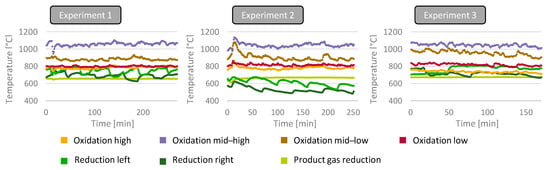 2 in the gasification agent in the reduction zone, a significant drop in the temperatures in the reduction zone was observed while all other temperatures remained on similar levels compared to the first experiment. The usage of a feedstock with a higher water content, as investigated in experiment 3, showed a slight decrease in overall temperatures but the temperatures in the reduction zone. The time course of the most important reactor temperatures is illustrated in