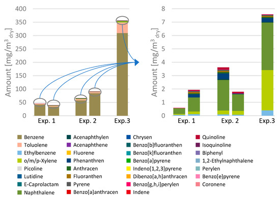 3/h. The obtained liquid from the impinger bottles was collected, all equipment was flushed with 2-propanol, and the resulting liquid was unified with the sample. To prevent any degradation of the samples, they were stored in brown glass bottles with PTFE seals and stored at −10 °C until they were analyzed via gas chromatography–mass spectrometry (GC-MS). The samples were screened for Benzene, Toluene, Xyloles (BTX-fraction), 16-EPA-PAK, and other aromatic and non-aromatic hydrocarbons. Detection limits observed in the analysis depended on the overall sample condition and ranged from 0.05 to 0.18 mg/m