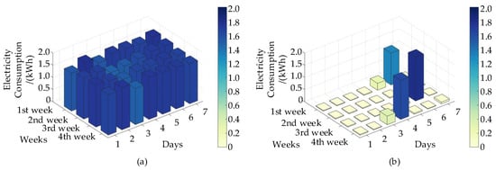 Through Figure 1, it can be observed that the electricity-consumption patterns of regular users exhibit a consistent regularity each week, while there is a noticeable difference in the electricity usage of electricity theft users in the second week compared to the other three weeks. Therefore, this study considers plotting the electricity-consumption graph on a weekly basis to observe the consumption patterns of electricity customers. In the graph, each week is represented on the vertical axis, and each day within a week is represented on the horizontal axis. The electricity-consumption bar chart is generated using data from the first 28 days (4 weeks) as shown in Figure 2.