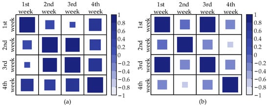 Furthermore, to better analyze the periodicity of user electricity consumption, this study incorporates the Pearson correlation coefficient to measure the degree of correlation between consecutive weeks. Figure 3 depicts the correlation in weekly electricity-consumption patterns between normal users and electricity theft users.