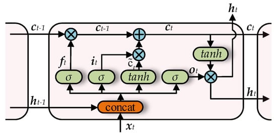 Given that users’ electricity-consumption data constitutes a complex long sequence classification problem [24], LSTM was particularly well-suited for feature extraction in this application. LSTM is a specialized form of RNN designed for handling long-term dependencies in time series data, and its structure is shown in Figure 4. Unlike traditional RNNs, LSTM excels in processing significant events with extended intervals. It introduces memory cells, input gates, output gates, and forgetting gates to effectively capture and manage crucial long-term dependencies in sequences. This architecture overcame the gradient-related challenges associated with traditional RNNs, making it well-suited for predicting and processing events with prolonged intervals in time series data.