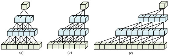 Comparison of different convolution modes. (a) Convolution. (b) Causal Convolution. (c) Dilated Convolution.