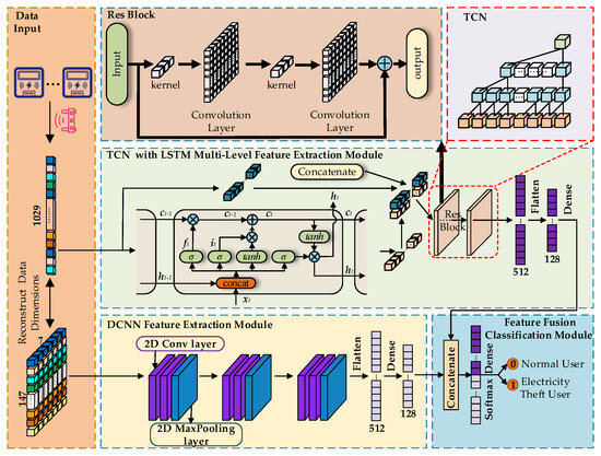 In order to improve the accuracy of electricity theft detection, this paper proposes a novel electricity theft detection strategy based on dual-time feature fusion and deep learning methods. This strategy uses temporal convolutional networks (TCN) with long short-term memory (LSTM) multi-level feature extraction module (LSTM-TCN) and deep convolutional neural network (DCNN) to extract the user’s one-dimensional power-consumption features and two-dimensional power-consumption features in parallel. Then, the power-consumption characteristics of dual-time scales are coupled, user classification is performed through a fully connected (FC) layer, and, finally, electricity theft detection is realized. In order to verify the effectiveness of the proposed method, this paper uses the State Grid Corporation of China (SGCC) dataset [11] to conduct simulation experiments and compares it with other electricity theft detection model algorithms. These comparative models include support vector machine (SVM) [12], random forest (RF), extreme gradient boosting (XGBoost) [13], gradient boosting decision tree (GBDT), 1D-CNN, 2D-CNN, DCNN, LSTM-TCN, and CNN-LSTM [14]. The results indicate that, compared to the comparative models, the proposed model outperforms in terms of accuracy, recall, F1 score, and area under the receiver operating characteristic curve (AUC), and it achieves the second-best performance in precision. The proposed electricity theft detection strategy not only exhibits higher accuracy and outstanding performance but also demonstrates superior performance under different training set proportions. In this context, the proposed electricity theft detection strategy shows excellent robustness. The main contributions of this paper are summarized as follows: