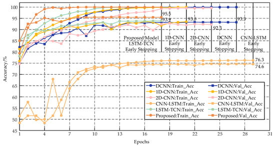 Figure 8 presents the training process of the proposed model alongside five comparison deep learning models, offering insights into the training performance of these models. The training set accuracy (Train_Acc) and validation set accuracy (Val_Acc) serve as key evaluation metrics throughout the training of various models. Additionally, the epochs at which each model concludes training are marked in Figure 8.