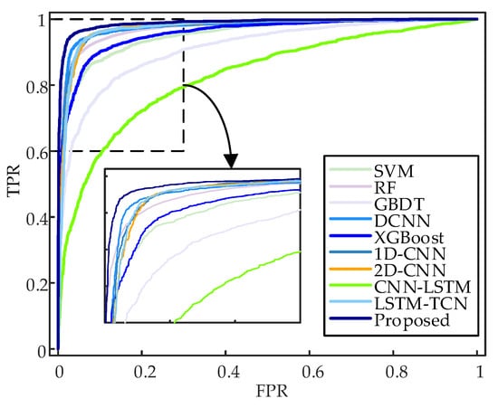 From Figure 9e, it is evident that under different training set proportions, the proposed model exhibits a notable improvement in AUC compared to the comparison models, achieving the best performance. When the training set proportion is 80%, ROC curves are plotted based on the variation in TPR at different FPR levels for each model, as illustrated in Figure 10.