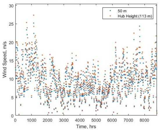 The wind speed data are from NASA’s Power Data [38], set at 50 m, located in Dogger Bank (in the North Sea), the site of multiple current and future GW-scale wind farms. The data set is one year long (2022), with subsequent years of operation assumed to be identical. A well-used approximation for hub height wind speeds [39] compared to the reference (measurement) height above the ground is used, and a ground roughness exponent coefficient is used, set at 0.1 for water. This equation is given as (1),