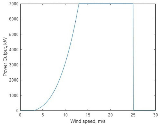 The power output for a specific turbine model can be calculated (the Siemens Gamesea Halide-X, rated at 7 MW), using the height-adjusted wind speed. A sample wind power curve is shown in Figure 4, showing the four operational ranges (bins) of wind speeds that result in different performance characteristics [39].