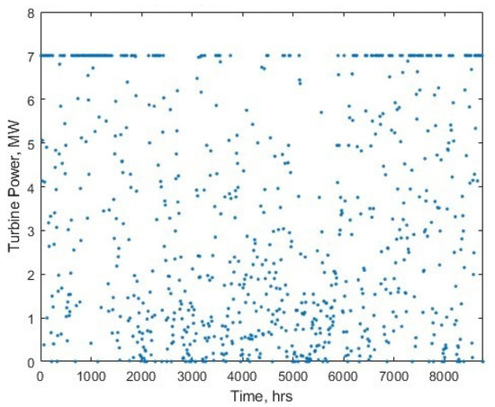 with being the rated maximum power output of the turbine. The third bin is between and , and the power output is the maximum rated turbine power. Above there is no power output, as the turbine is turned off at high wind speeds for safety reasons. The power output is scaled by the number of turbines (a tunable parameter) operating in the system. Figure 5 demonstrates the final wind generation time series for use in the model.