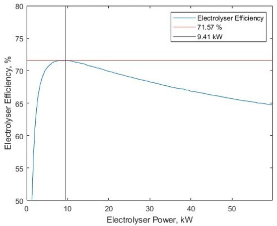 The implementation of a power–efficiency plot to determine the gas mass production rate for different input electricity magnitudes characterises the role that gas post-processing plays in shifting the efficiency point; for example, reducing the electrolysis input from 60 kW to 50 kW changes the efficiency from 64.7% to 65.7% (Figure 6), which increases the theoretical yield compared to a scalar efficiency coefficient across the same range. The limitations through the assumptions made are important to consider; the electrolysers are all assumed to be identical and receiving the same power input at the same time and thus the estimated power–efficiency readings will be different. The gas post-processing, however, does use scalar coefficients, and subsequent analysis with more complex modelling will be insightful for understanding the associated sensitivities. The limitation of all gas post-processing confined to the same timestep as the gas creation can be further investigated for scenarios where the exclusion of byproduct oxygen is preferred, such as using intermediate gas storage, and post-processing the gas when significant surplus events occur.
