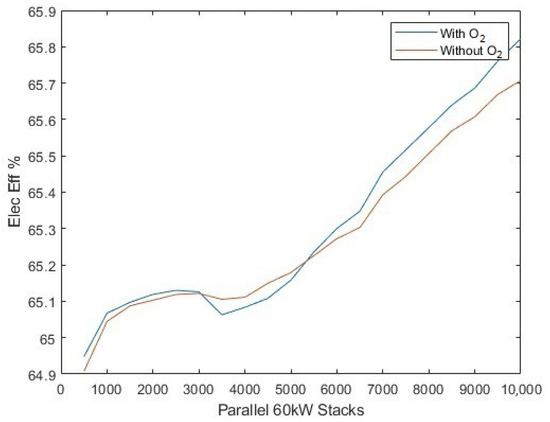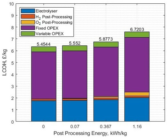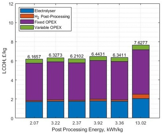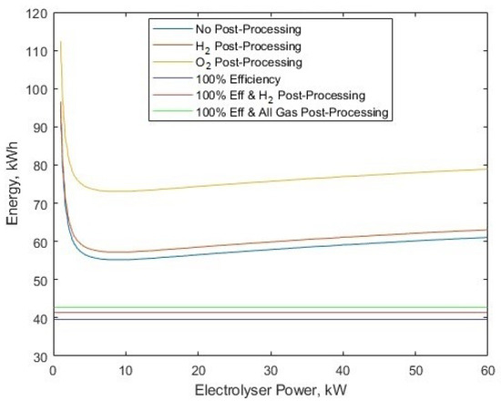 Some commentary must first be made when showing the reference work [30] as a comparison to this work’s model. The system boundaries are different, since the literature case includes the transportation of hydrogen via ships, with the incurred costs and inefficiencies included. Also, the electrolyser model is much more crude, as it is simply an electricity–hydrogen conversion scalar, of 52–60 kWh/kg for PEM electrolysers, depending on the year when considering efficiency improvements. The LHV for hydrogen energy density was used as well, which is arguably less commonly used in the electrolysis literature, but the new model is able to accommodate either LHV or HHV. Figure 7 shows the required energy per kg for hydrogen, which is in line with the figures given by the reference material [30], of 60 kWh/kg in 2018 and 52 kWh/kg in 2025.