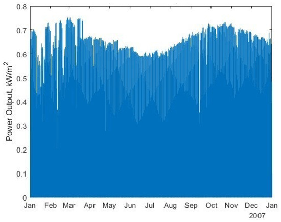 Figure 8. The solar-PV power output per unit area for the selected Atacama Desert location for 2007. - Economics Parameters;