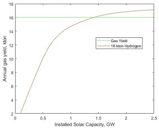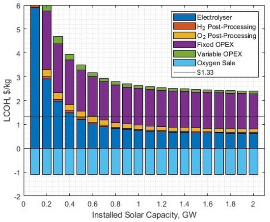 The reference work gave an LCOH without post-processing of the hydrogen gas. In the model, by removing the energy requirement for gas post-processing, it is possible to enact a direct comparison of the LCOH between the model and the reference case. The reference case was seeking to meet a hydrogen demand of 16 million kg of H2 per year. In the reference case (PEM electrolyser for 2025), this was achieved with a 345.2 MW installed capacity of electrolysers. To compare to this, the electrolyser count was set to 575,460 kW electrolysers (the equivalent to the source figure of 345.24 MW installed capacity), and the installed solar-PV capacity was varied iteratively. With the set electrolyser fleet size and no compression energy, the 16 million kg annual production is achieved with 1.41 GW of installed solar power, with a resulting LCOH of $1.95/kg, Figure 9. This value is consistent with the PEM photovoltaic direct connection scenarios [30] for 2018 ($3.31/kg) and 2025 ($2.19/kg).