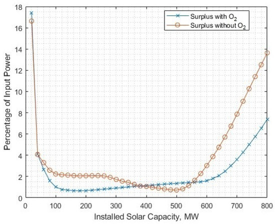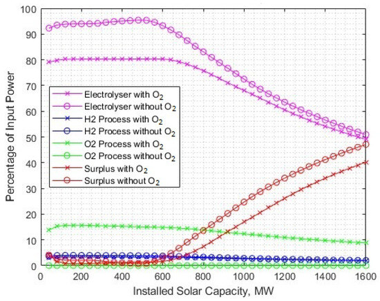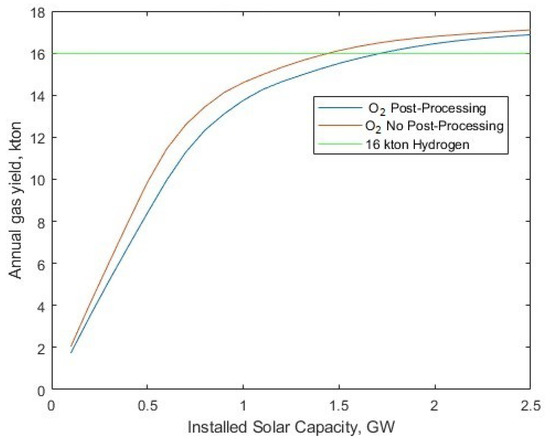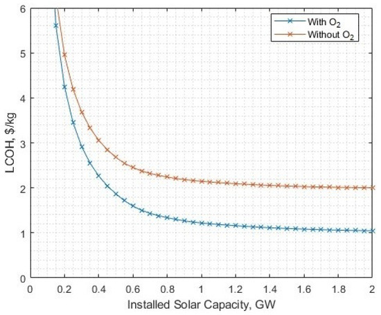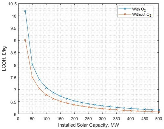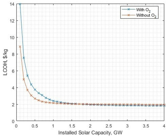 The selected work to make a first comparison simulates Solar-H2 production in the Atacama Desert in Chile, which has some of the highest rates of solar irradiation in the world, and can thus deliver an extremely low cost of solar electricity [30]. It was selected as a comparison piece due to the similarity of modelling topology and aims, but notably differs in key areas that the current work hopes to demonstrate a new contribution. There is a dual advantage in validating the model and displaying outputs as results. The validation will confirm that this model is performing as expected when compared to the reference case, but additionally due to the parallel outputs (with/without oxygen post-processing/sale), direct analysis of the advantages and disadvantages of including oxygen can be seen, and the operational ranges over which any advantages occur.