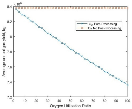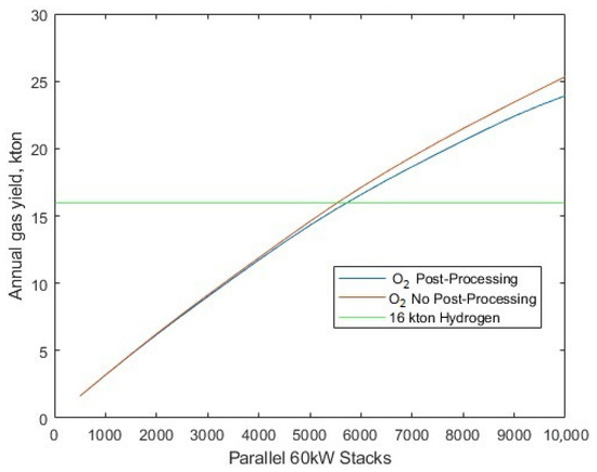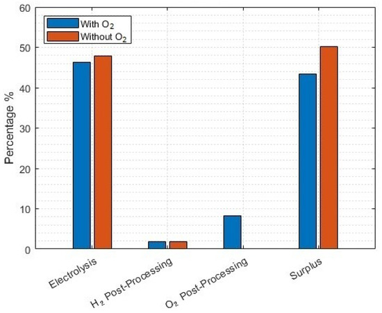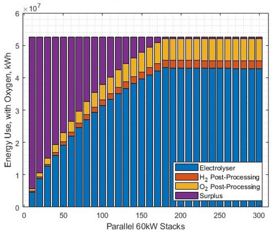 The label of green hydrogen would only apply if the energy used in electrolysis incurred no carbon emissions. This body of work intends to determine the effects on the inclusion of oxygen in the model. Oxygen, like hydrogen, requires compression or liquefaction for subsequent use down the supply chain. The gas processing energy must also have no carbon footprint, else it would compromise its green status. Thus, the power for gas post-processing must also come from renewable energy power sources. This model assumes that all gas is processed in real time (within the same timestep) alongside electrolytic inception, and fixed gas processing energy requirements per kilogram are used. The assumption used in this model is that the gas processing is carried out in the same timestep as the gases being produced electrolytically, to show the extent of possibility of the process. Further work could be undertaken to include additional processes such as intermediate gas storage between the stacks and the gas compressors.