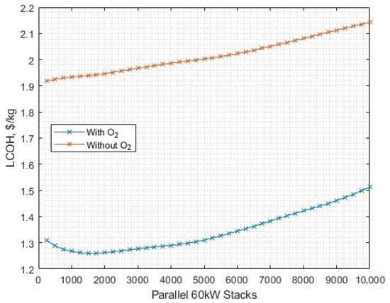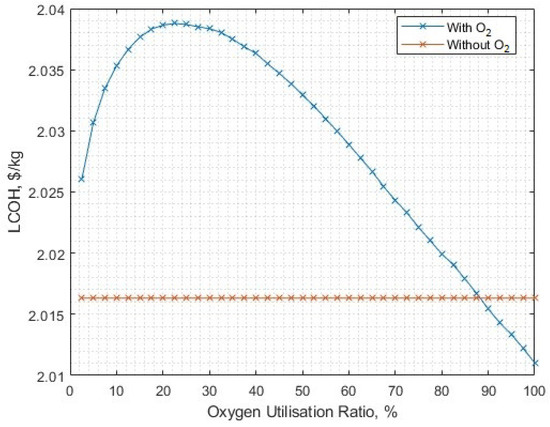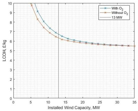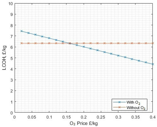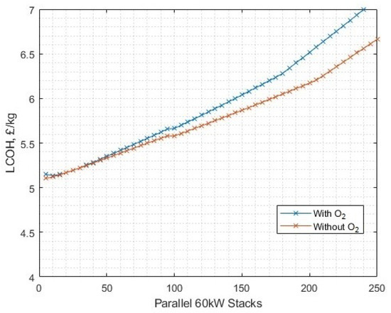 The two case studies returned significantly different outcomes for oxygen. This can be explained by the electricity cost, which was a significant fraction of the contribution to total LCOH. The much lower electricity costs used in case study 1 compared to case study 2 provided for many more viable scenarios of beneficial byproduct oxygen inclusion. The context for the electricity costs used in case study 2 are of interest, however, since the predictions for the cost of offshore wind power are still falling, and this will result in benefitting electrolysis scenarios both with and without oxygen co-production. The two case studies returned appropriate yields of oxygen when compared to a similar study [17], when also considering other factors such as power source load factor or electrolyser efficiencies.