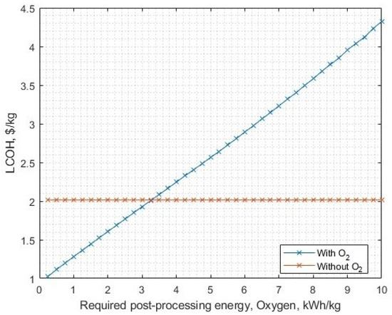 The inlet and isentropic outlet enthalpies were calculated with REFPROP, Version 10.0 [45] for the temperature matching the electrolyser output (80 °C) and chosen electrolyser pressures (atmospheric and 30 bar), and a compression efficiency of 70%. For compression to 137 bar, the compressor required 0.367 kWh/kg from atmospheric pressure, and 0.070 kWh/kg from 30 bar initial pressure. These values, alongside the liquefaction energy requirements are used in the model to provide demonstrative post-processing energy requirements of oxygen.
