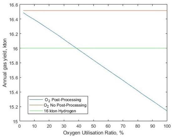 With anticipated electrolytic hydrogen production targeted for 5 GW of production in 2030 [24], justifying the utilisation of a significant fraction of byproduct oxygen would require estimates of the market size. Electrolysis efficiency of 100% and a hydrogen energy density of 142.2 MJ/kg (HHV) results in 1.11 billion kg of hydrogen annually and, equivalently, 8.80 billion kg of oxygen. The Netherlands is estimated to use 2.5 billion kg per year [25] and through extrapolation based on differences in GDP, this could mean the UK is using around 13 billion kg of oxygen per year. Therefore, the full utilisation of byproduct electrolytic oxygen from a 5 GW national electrolyser fleet (assuming no losses) could address around 8.5% of an estimated oxygen market.