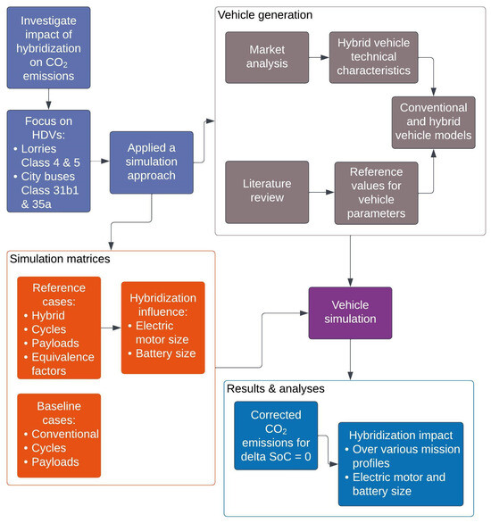 Regarding the hybridisation type, the focus was on vehicles without grid charging, i.e., plug-in hybrid vehicles were not included. The first step of the investigation was to obtain the technical characteristics of actual vehicles by realising a market analysis. Subsequently, the market analysis provided the basis for creating the reference vehicle models in the simulation tool, which comprised the reference cases. It was important for the simulated vehicle models to have characteristics that addressed the same needs as those of actual vehicles. Considering this, both conventional and hybrid versions of the vehicle models were created; the conventional versions were needed to establish a baseline. These steps established the base cases, which were used to perform further analyses on hybridisation.