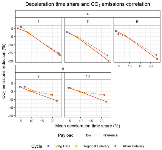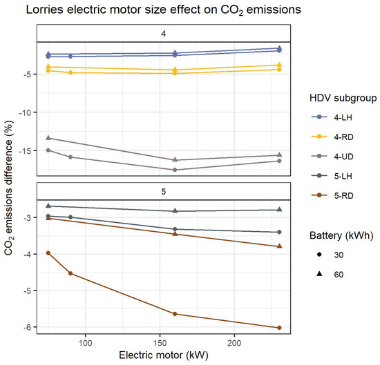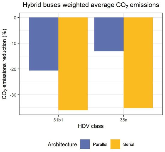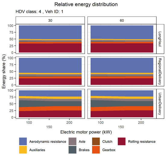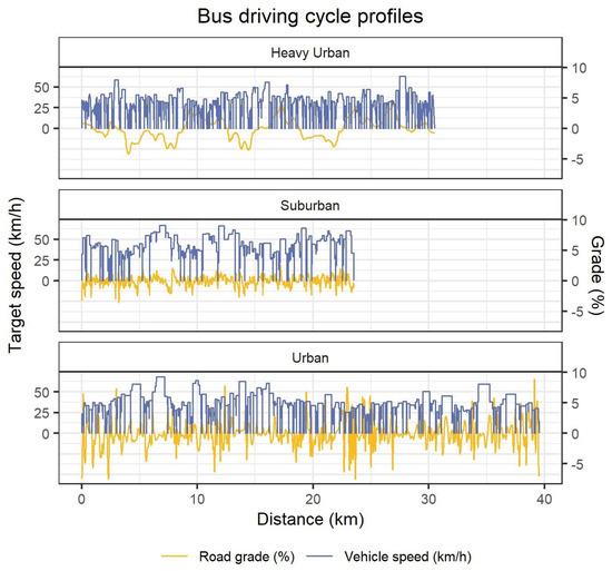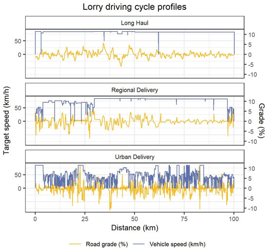 The vehicles were simulated over all the mission profiles, and the average weighted CO2 emissions were calculated utilising the respective weighting factors from Regulation (EU) 2019/1242 for lorries [3] and the European Commission’s proposal for buses [12]. Table A4 in Appendix A provides the respective mission profile weights.