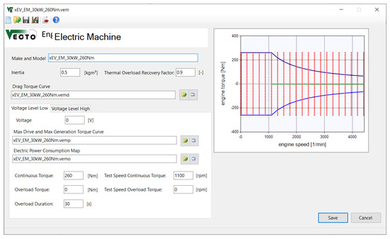 The EM is described similarly to the ICE: an efficiency map and an operation limit curve. The efficiency map—in this case, the electric power consumption map—is a grid of operating points in an engine speed and torque cartesian system in which each point has an electric energy consumption value. The EM operation limits were set with the max drive and max generation torque curves as the full load curve is in an ICE. In addition, the drag torque curve indicates the motor drag when it is not producing power but is set in rotation due to the vehicle speed, such as when under motoring conditions. Figure 4 presents the VECTO interface of the inputs for the electric motor, along with an example of an energy consumption map and max drive torque curves.