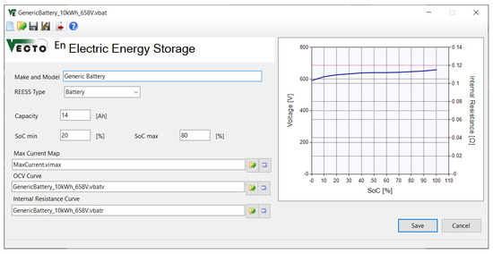 The VECTO battery inputs require capacity, a minimum and maximum SoC, a max current map, the Open Circuit Voltage (OCV), and internal resistance curves. Figure 5 presents an example of the generic battery inputs in VECTO. The VECTO generic battery was used to generate the battery cases. Most of the generic parameters were retained, but some needed to be scaled to represent the different battery capacities properly.