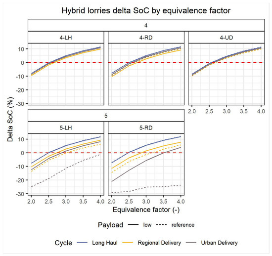 The HDV class 4 vehicles showed behaviour more consistent with that of the delta SoC, ranging between −10% and 10% for all cycles and payloads. However, the HDV class 5 showed a wider range, from −30% to about 15%, while in some cases, the EF range could not deliver a delta SoC equal to 0%.