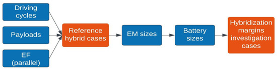 The simulation cases focused initially on the variations in payloads by mission profile, while the parallel hybrids also included EF. This initial plan provided a reference behaviour of hybrid vehicles that share representative characteristics with market-available vehicles. Subsequently, the effect of different EM and battery sizes was investigated by further expanding the simulation matrix. Figure 7 presents a flowchart of the simulation case generation, which was applied to each vehicle.