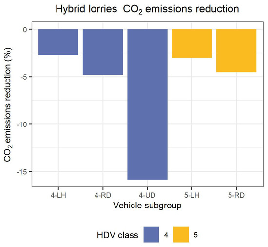 The analysis showed notable emission reduction benefits for different applications within HDV class 4 and class 5 categories. Among HDV class 4 vehicles, the Urban Delivery (4-UD) application showed the highest improvement, achieving a 15.9% reduction in emissions. Next, the Regional Delivery (4-RD) application exhibited a reduction, albeit at a lower rate of 4.8%. Conversely, the Long-Haul application (4-LH) demonstrated the lowest improvement, with emissions reduced by a limited 2.7%.