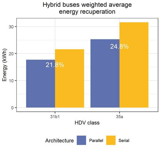 There were significantly more options for city buses, with more manufacturers offering hybrid models with either serial or parallel architectures. Following a similar trend, manufacturers seem to focus on pure electric models, while—although out of the scope of the current study—no plug-in hybrid models were identified. Table A2 presents the hybrid city buses and their technical characteristics, with missing data indicating that it was not possible to retrieve relative values from official sources. There was information related to EM power, but less information about the batteries. The available sources provided representative values of their capacity and indicated that deployed lithium-ion nano phosphate batteries.