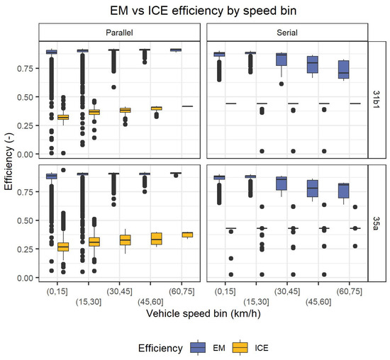 Regarding the architecture, parallel hybrid models had a P2 topology, meaning that the EM was connected between the clutch and the gearbox. Since all models deployed this topology, they are referred to simply as “parallel” from now on.