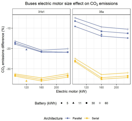 The next analysis was the comparison of hybrid vehicle performance with their conventional counterparts; the baseline cases. This analysis was important to highlight cases where the hybrid effect was more prominent and where it was reduced. Subsequently, the EM and battery size sensitivity analysis indicated for which cases there is still the potential for further reductions in CO2 emissions. Further analyses on the energy distribution in the vehicle contributed to this end. In addition, buses deployed both serial and parallel architectures that offered an opportunity to compare the performance and powertrain efficiency of the two architectures.