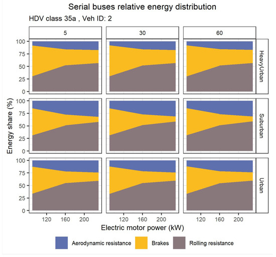 The current study focused on hybrid lorries (N3 category) and city buses (M3 category) in Europe by investigating their performance with a simulation approach utilising the Vehicle Energy Consumption Calculation Tool (VECTO), which is the official tool of the European Commission for simulating CO2 emissions from heavy-duty vehicles [7]. The tool has been extended to hybrid powertrains by including various architectures, e.g., serial and parallel hybrids, energy management strategies, and electrified auxiliaries [8]. The latter is essential, as many components that are powered by the internal combustion engine in conventional powertrains need to be electrified in hybrids. However, the most significant aspect of hybrid powertrains is the energy management strategy that defines the engagement of the internal combustion engine and the electric motor based on the power demands and battery state of charge. The tool’s accuracy has been validated and found to have a maximum error of 2.5% and 1.5% for fuel and electrical energy consumption, respectively [9].