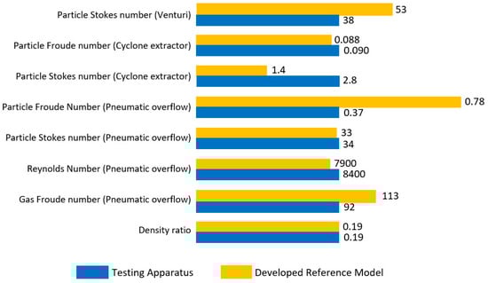 Figure 2 provides a visual depiction of how close the dimensionless match is between the cold prototype (blue) and the hot reference model (yellow). For the venturi, the particle Stokes number is higher in the hot model than the cold prototype. For the cyclone extractor, the Froude number provides good similarity, but this is not true of the particle Stokes number, which is lower. For the pneumatically assisted overflow weir, the Stokes, Reynolds and gas Froude number provide good similarity. This is not true of the particle Froude number for the weir however, which is approximately half. The density ratio, between the cold prototype and hot model, is an exact match, which should negate any differences in density effects.