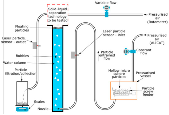 Process flow diagram (PFD) of the cold prototype reactor configuration. Pressurized air is passed through a flow meter and used to convey the hollow microsphere particles into the nozzle at the base of the test column, where they are bubbled by the air vertically, through the fluid column, towards the separation technology test area. Pressurized air is fed through a rotameter into the separation technology to remove the microspheres from the separation zone and convey them into the particle collection area, which is placed on a set of scales. Laser particle sensors are employed on the inlet and outlet to ensure particles are entering and exiting the system.