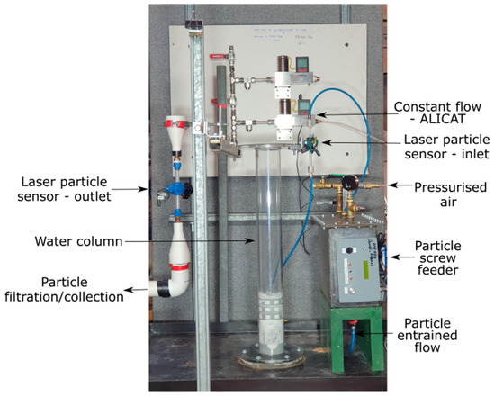 Figure 4 shows the experimental apparatus of Figure 3, as used for testing. The red square (Figure 3) indicates where the separation technology is attached to the column. The position of the flow valves, pressurized air, particle sensors and filtration and collection system is also indicated.
