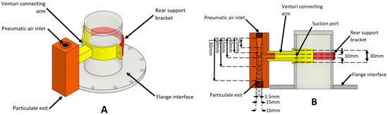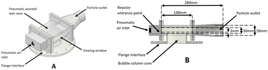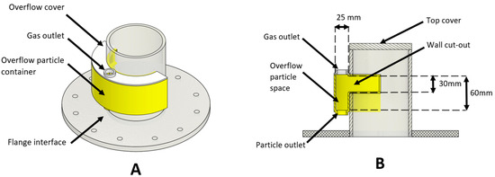 Schematic representation of the developed cold prototypes of the overflow weir, pneumatic-assisted overflow weir, cyclone extractor and venturi ejector concepts used in this investigation are shown in Figure 5A, Figure 6A, Figure 7A and Figure 8A, respectively. The cross-sections of these systems together with their main dimensions are also shown in Figure 5B, Figure 6B, Figure 7B and Figure 8B.