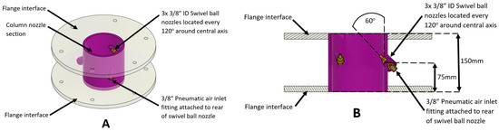 Each of the particulate removal devices (shown in Figure 5, Figure 6, Figure 7 and Figure 8) were installed on the top of the cold prototype bubble column reactor (indicated in red in Figure 3) for testing purposes. During the experiments, the volumetric flow rates of the inlet air to the column were monitored and each removal mechanism was tested across a range of inlet gas flow rates () to determine its effectiveness in removal of the particles from the reactor. The flow rate of the outlet air ( is equal to the sum of the flow rates of two airstreams ( and ). The first airstream is injected into the column to carry the particles into the system () and simulate the bubbling regime of the reactor, while the second the airstream () is injected to pneumatically remove the particles. The flow rate of the air injected into the reactor column, , was fixed at 14.5 standard liters per minute (SLPM) to ensure the matching of the identified dimensionless groups between the hot and cold prototype reactors (listed in Table 3 and Table 4). However, the flow rate of the injected gas employed to remove the particles pneumatically was changed to assess the performance of each concept. In each experiment, a fixed airflow rate was set for a period of 10 min, while the mass of particles removed from the system was continuously measured and recorded. This was then used to generate the mass removal rate in mass per time, e.g., g/min. The pneumatic airflow speeds into the removal concepts were also area averaged to yield superficial gas velocity. On this basis, the gas fraction (Equation (2)) shows the pneumatic airflow rate through the removal mechanism against that of the bubble column flow rate.