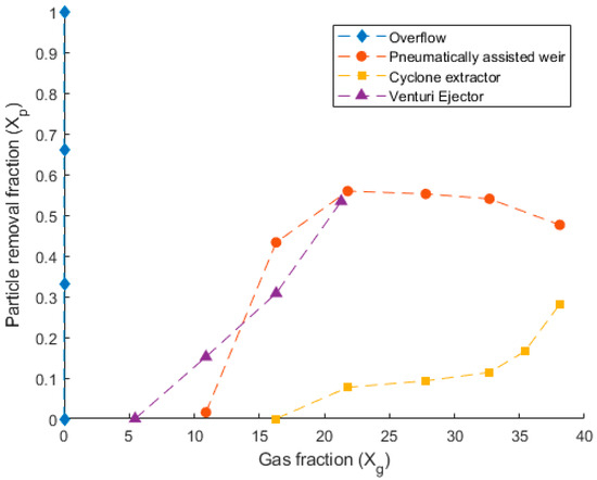 Figure 9 presents the performance of each removal method in the cold prototype test apparatus. Depicted is the particle removal fraction () and the gas fraction (). It can be seen from Figure 9 that the performance of each concept is different and linked to the gas fraction at each instance. The removal performance of the pneumatically assisted weir was seen to increase sharply as the gas fraction increased between 10 and 20. This reached a peak removal rate of 55%, in which the assisted weir was able to remove 55% of all particulates entering the system. After this, the performance of the assisted weir stagnated, declining as the gas fraction was increased beyond 30.