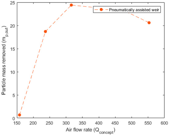 Performance data for the pneumatically assisted weir. Airflow rate () in SLPM is shown vs. the particle mass removed () in grams for each of the 10 min trials conducted at a fixed speed (circles).