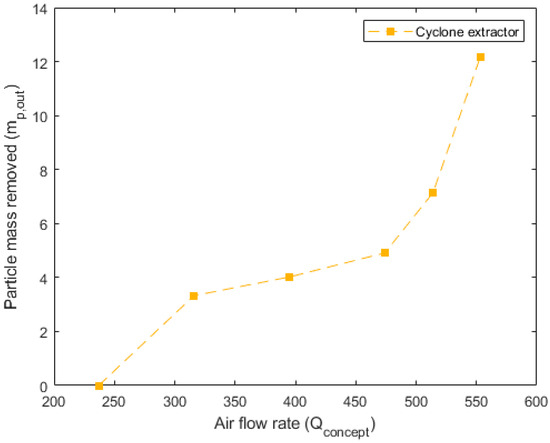 Performance data for the cyclone extractor. Airflow rate () in SLPM is shown vs. the particle mass removed () in grams for each of the 10 min trials conducted at a fixed speed (circles).