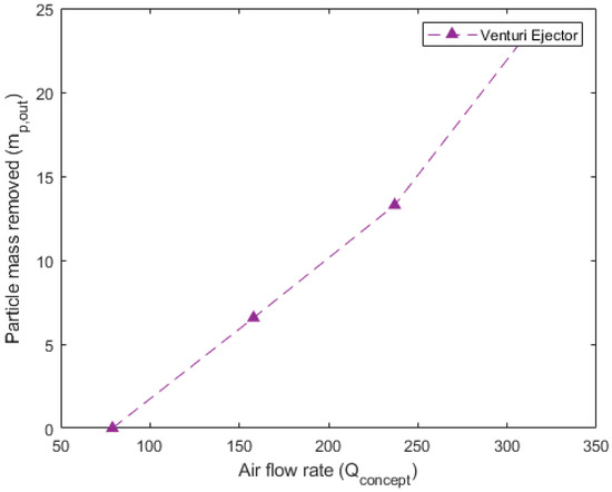 Another important aspect is the airflow rate required to reach the maximum particulate removal. For the pneumatically assisted weir, this occurs at 316 SLPM, 553 SLPM for the cyclone extractor and 308 SLPM for the venturi ejector. The lower relative airflow rates of the pneumatically assisted weir and venturi ejector highlight their suitability for industrial applications. This is because, in an industrial device, the net energy requirement for the removal of a given mass impacts the final production cost, which includes the required flow rate, cooling of the hot gas phase and compression before reinjection to a particle removal device. Relatively low airflow rates, but high extracted mass, such as those seen in the assisted weir and venturi ejector (Figure 10 and Figure 12), incur lower parasitic energy requirements than the cyclone extractor, which requires much higher flow speeds.