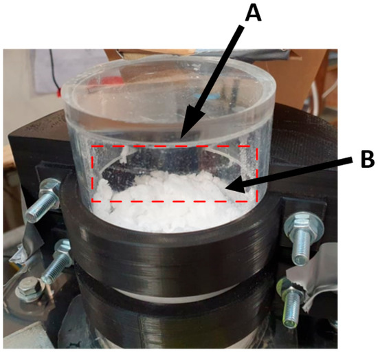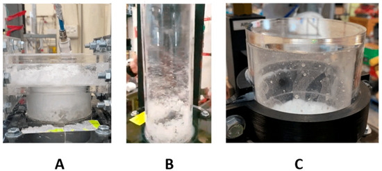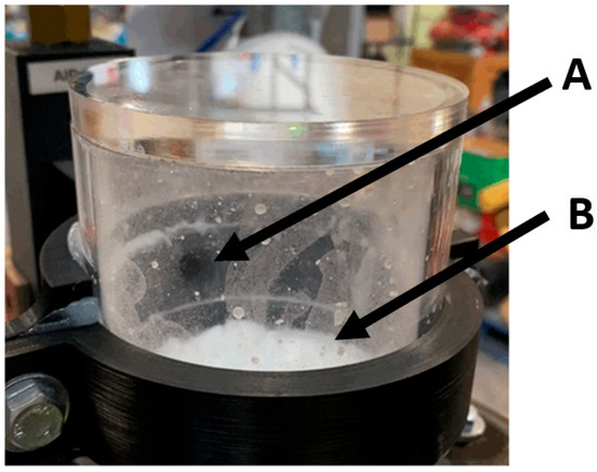 Mechanically, the operation of the overflow concept was the simplest. This can be seen in Figure 14. The particulate level would build over the duration of the 10 min trial. When this level was sufficiently high, the particles would overflow the sides of column and into the extraction system. Whilst this worked well initially, resulting in predominantly particulate separation, the bubbling of the column resulted in water being extracted. The combination of particles and bubbling fluid caused the particles to clump, as can be seen at B in Figure 14. Operationally, this would present significant challenges in a MCB methane pyrolysis reactor, as the liquid metal may be extracted with any carbon particulate, complicating the refinement of the carbon product.