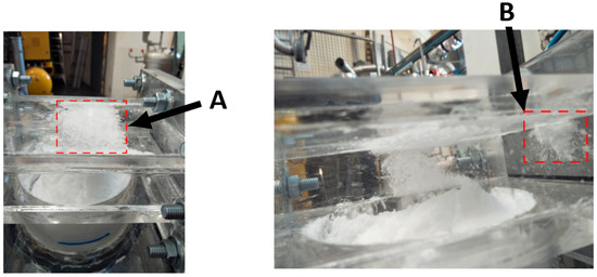 Operational image of the pneumatically assisted overflow weir. Left image is above the removal concept and the right image is a photo taken through the side wall. (A) shows particle splatter formation on the roof and (B) shows splatter formation on the side walls, above the inlet slit (bottom right).